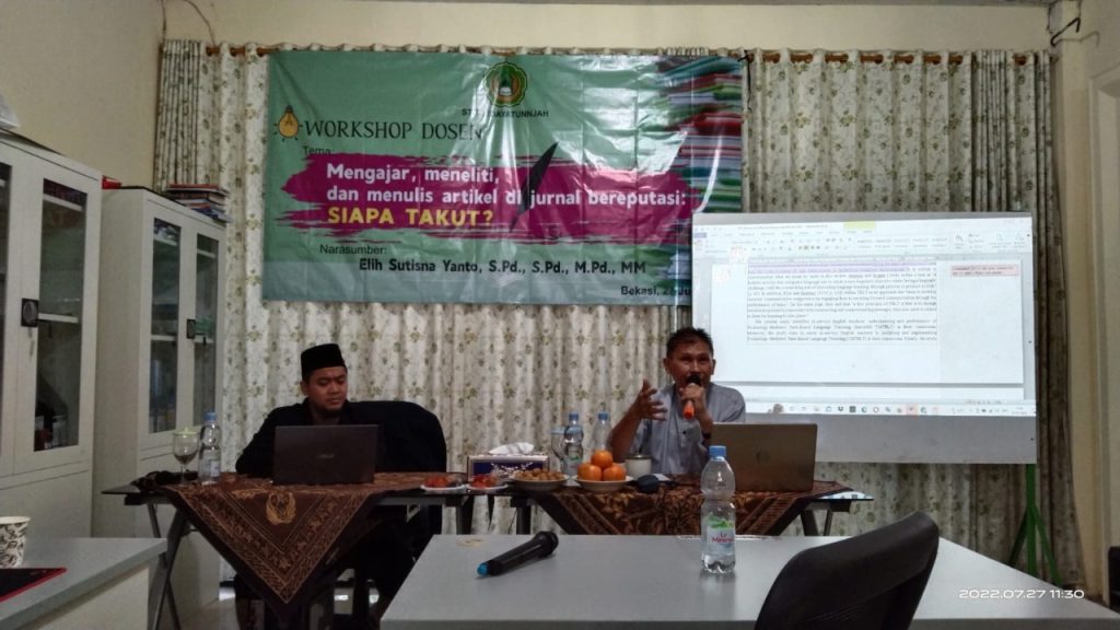 Dosen memiliki kewajiban mengajar, meneliti dan melakukan pengabdian kepada masyarakat. Dalam rangka meningkatkan kapasitas dosen dalam melaksanakan bagian tri darma tersebut, STIT Hidayatunnajah mengadakan kegiatan yang bertujuan memfasilitasi para dosen untuk melaksanakan kegiatan tri darma. Salah satu kegiatan itu adalah kegiatan Workshop dengan tema “Mengajar, meneliti, dan menulis artikel di jurnal bereputasi: SIAPA TAKUT?” yang di adakan pada tanggal 27 Juli 2022, di aula STIT Hidayatunnajah Bekasi.