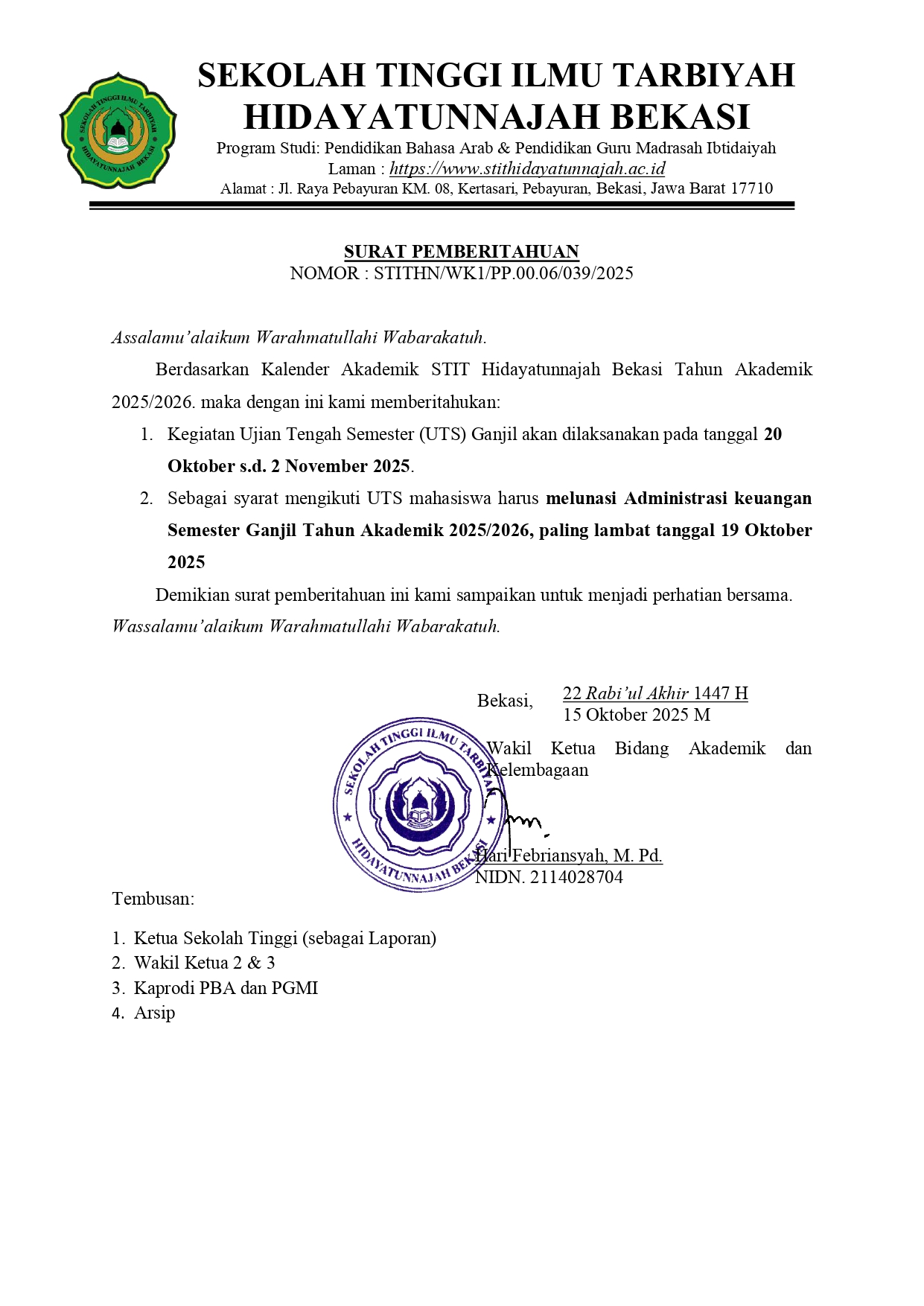STIT HIDAYATUNNAJAH BEKASI mengucapkan Selamat menyelenggarakan UTS Ganjil Tahun Ajaran 2025-2026 dimulai dari tanggal 20 Oktober s.d 2 November 2025, sebagaimana yang tertulis pada SK berikut;